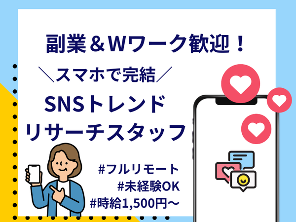 | 職種 | 【20〜30代活躍中】最先端SNSのリサーチスタッフ |